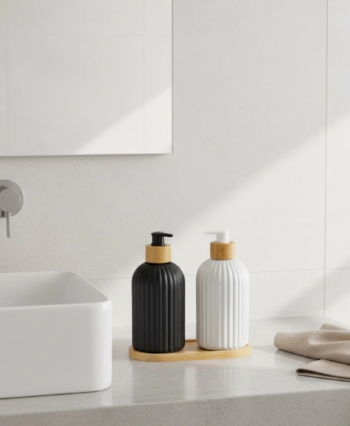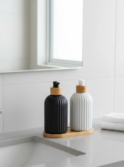 Settets to dispensere har en kapasitet på ca. 350 ml hver, med pumpe-mekanisme som er enkel å fylle og bruke. Den minimalistiske designen passer perfekt til organisering av såpe, sjampo eller lotion, og holder overflaten ren og ryddig.