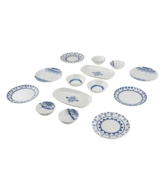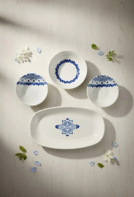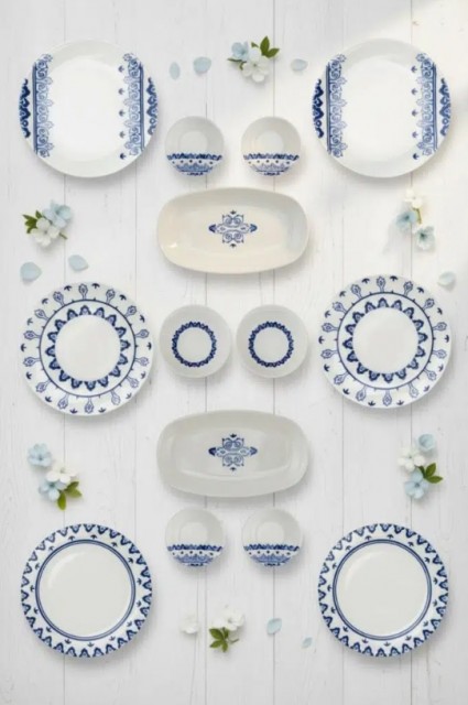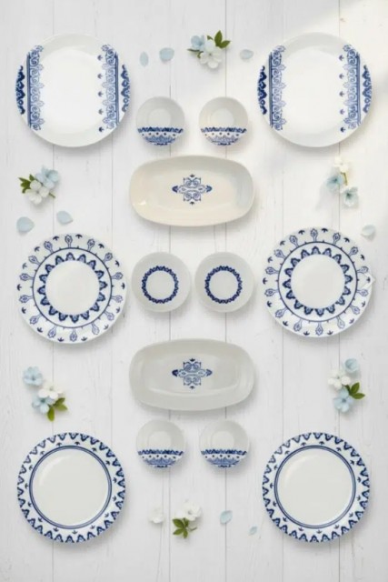 Settet er laget av slitesterkt, høykvalitets porselen med hvit bunn og blå Maku‑mønstre som gir et moderne,