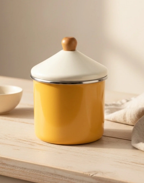 Låket er lett konisk formet for et nostalgisk emalje‑preg og sitter godt ned over kanten,
