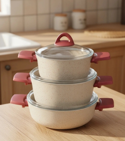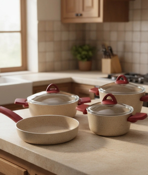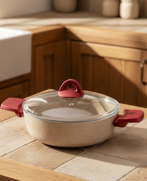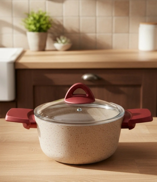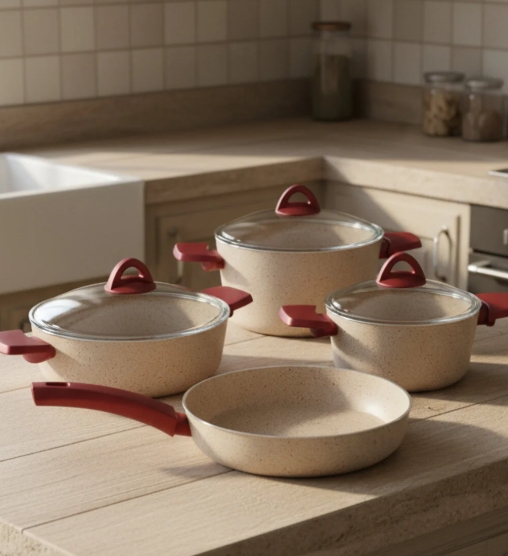 Granittbelagt innside gir non‑stick overflate, slik at maten slipper lett og kjelene er enkle å rengjøre.