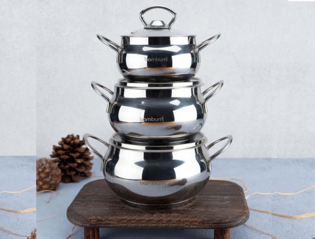 Settet består vanligvis av 3 gryter i ulike størrelser (for eksempel ca. 16, 20 og 24 cm) og 3 tilhørende glasslokk.