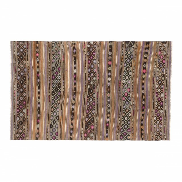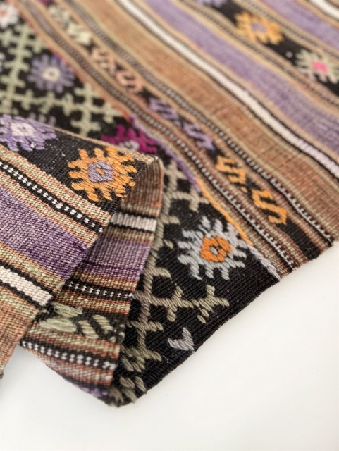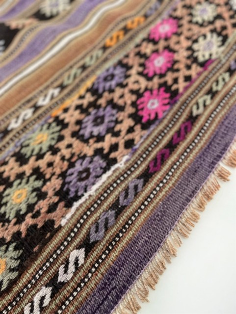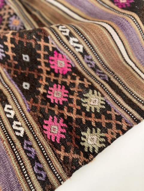Teknikk: Håndvevd med stripete mønsterdesign og broderi, ekstra kantbroderi