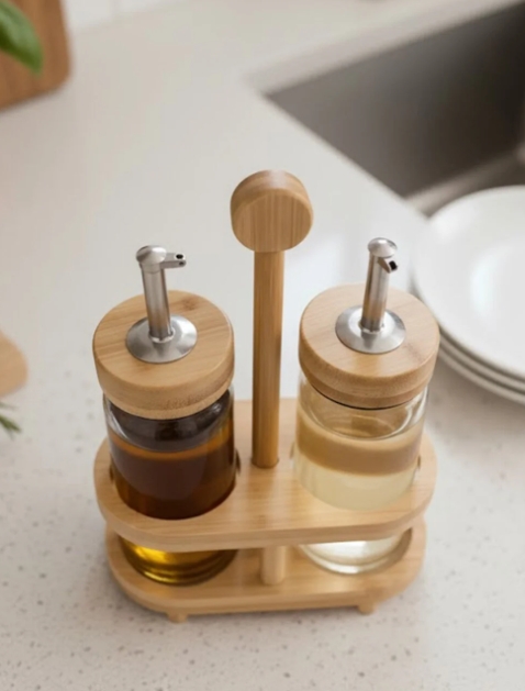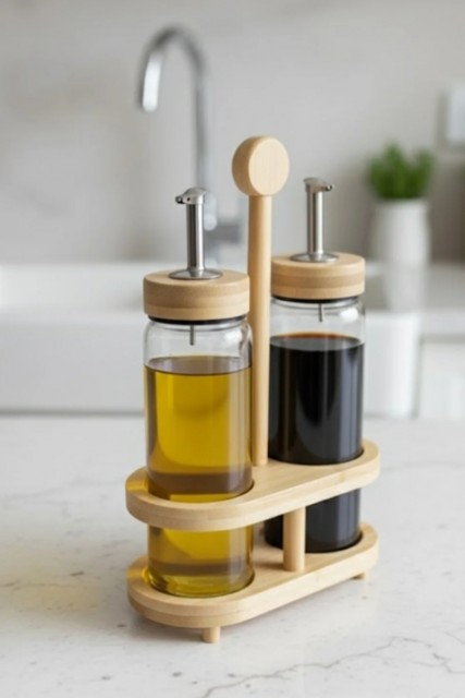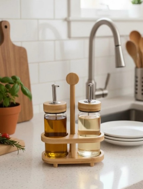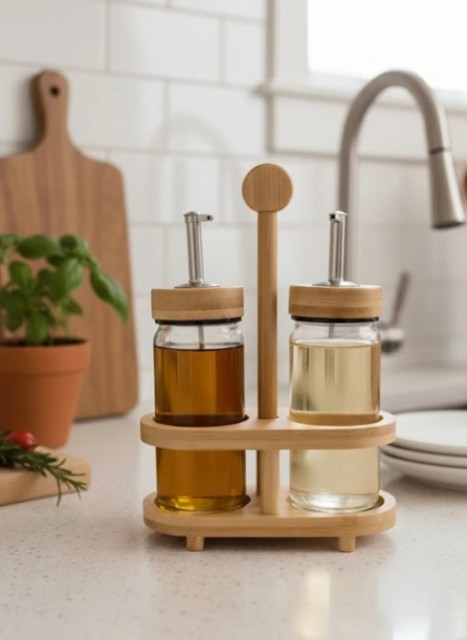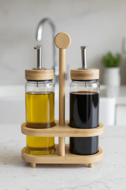 Bambusstativet holder oljeflaskene ryddig og estetisk organisert på benken. De to flaskene lar deg oppbevare ulike oljer separat for enkel bruk i matlaging. Bambusmaterialet gir et naturlig og bærekraftig valg til kjøkkenet.