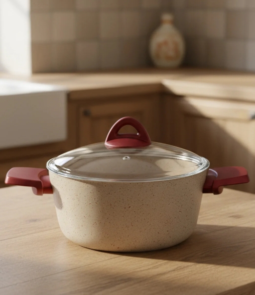 Granittbelagt innside gir non‑stick overflate, slik at maten slipper lett og kjelene er enkle å rengjøre.