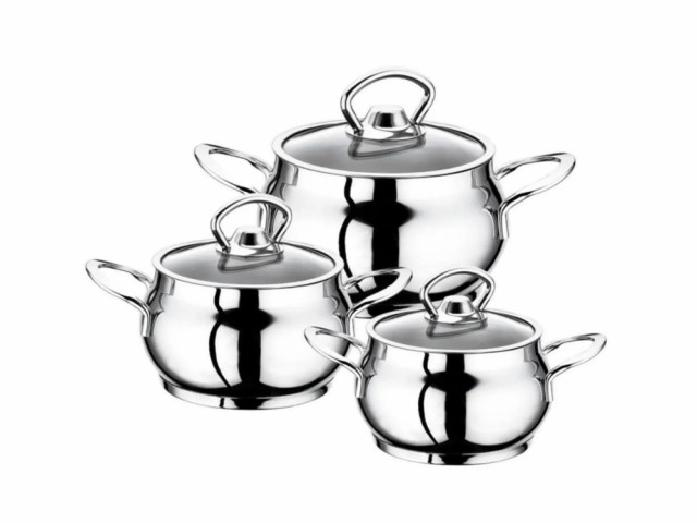 Settet består vanligvis av 3 gryter i ulike størrelser (for eksempel ca. 16, 20 og 24 cm) og 3 tilhørende glasslokk.